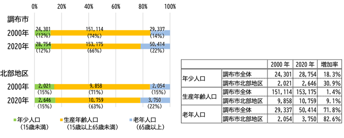 • 増加率では調布市全体に比べ、高い傾向です。特に年少人口は調布市全体が 18.3%の増加であるのに対し、調布市北部地区は 30.9%の増加です。また、生産年齢人口は調布市全体が 1.4%の増加であるのに対し、調布市北部地区は 9.1%の増加です。
